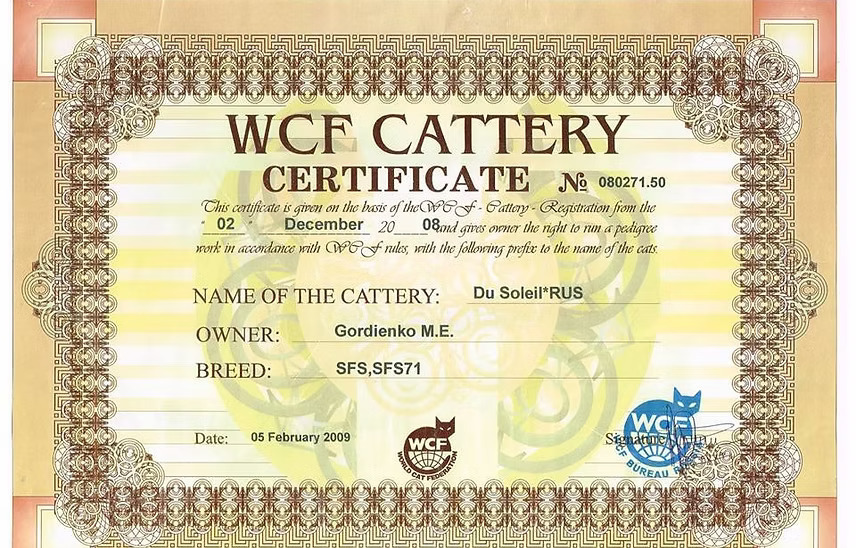 «Дю Солей» (DUSoleil). Регистрация питомника WCF CATTERY certificate 080271.50